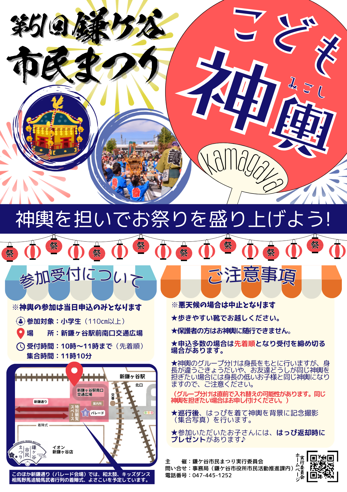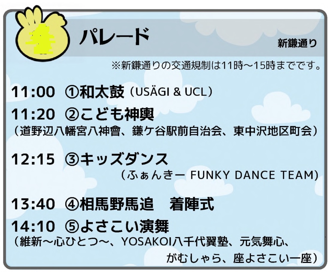 パレードの実施に伴い、まつり当日の11:00から15:00まで、新鎌通りへの車両の進入ができなくなりますので、恐れ入りますがご協力をお願いいたします。